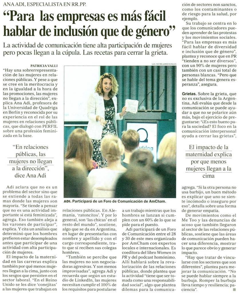As I prepare for my keynote about the future of public relations and the lessons we should learn from the feminization of the profession, an interview I gave to the Argentinian national-circulation paper, Perfil, has been published. You can find it here and below.