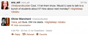 From there, to having him accept to join my Digital Communication Strategy students via Skype took 1 tweet, yes you’re reading it right: ONE. It took a couple of more tweets to set up the actual meeting and make it happen at time when he was in Europe however, that was to be expected.