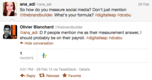 Mentions to monitoring and measuring social media efforts were often made and some of them included references to Olivier Blanchard and his Social Media ROI book but were not specific enough to indicate what the organizations that the speakers were representing were really doing to monitor and measure social media. If I were a student, I would have wanted to find that out rather than hear that there’s a book out there that people use or hear how great it is to work in and with digital and social media. I tweeted about that. It wasn’t in frustration or criticism, it was looking for an aswer.