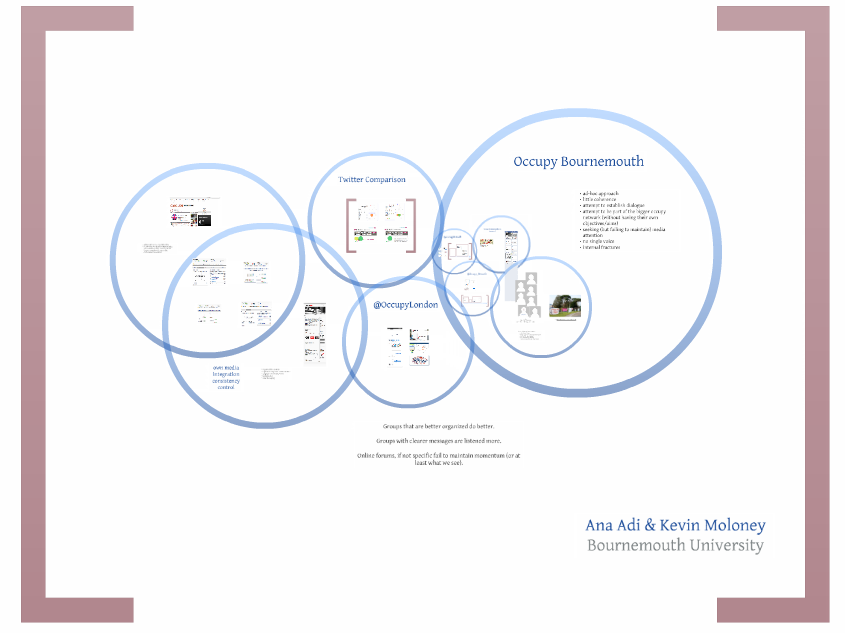 Our approach, highly qualitative, blends traditional interview and observation techniques, with a click-by-click analysis of the social media outputs of the Occupy Bournemouth group and other groups that they mention or are affiliated with. This is just the beginning of a longer endeavour looking into the uses of technology by advocacy and protest groups.