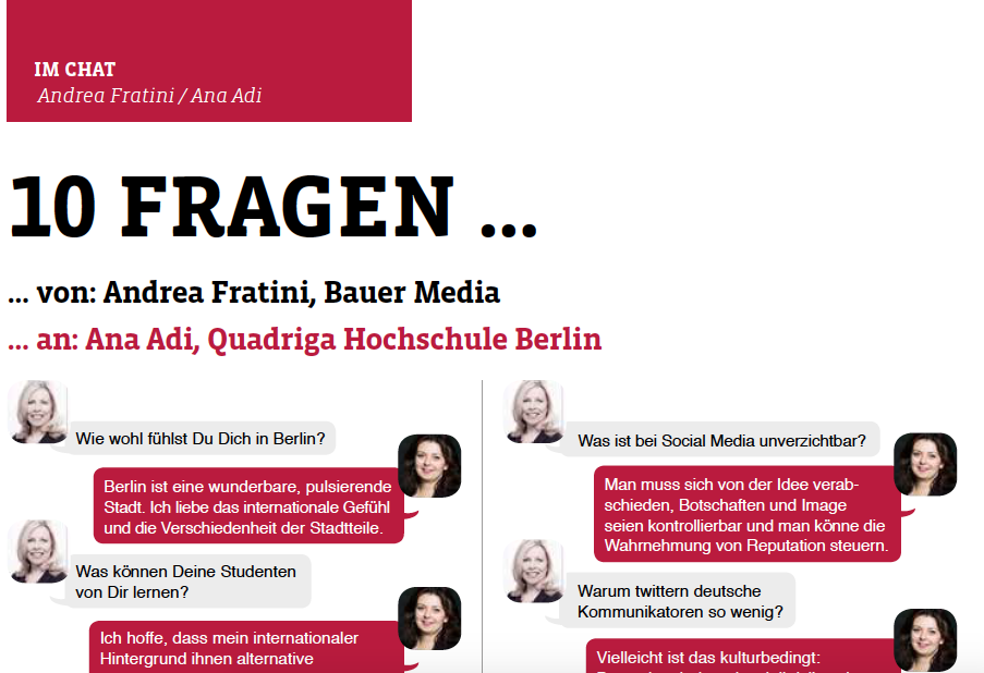 a magazine dedicated to communicators in Germany and beyond, by Andrea Fratini, Director of Corporate Communications at the Bauer Media Group. The “Im Chat” is a section where communicators ask other communicators about various issues relevant to their job and practice and the format is snappy, imitating the chat/sms conversations.