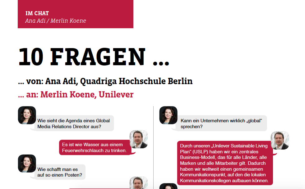 At the beginning of April, PR Magazin, a magazine dedicated to communicators in Germany and beyond, published my answers to Andrea Fratini‘s questions, Director of Corporate Communications at the Bauer Media Group in its “Im Chat” section. As the section is dedicated to communicators asking other communicators about various issues relevant to their job and practice, the rule is that the interviewee becomes interviewer for the next section.