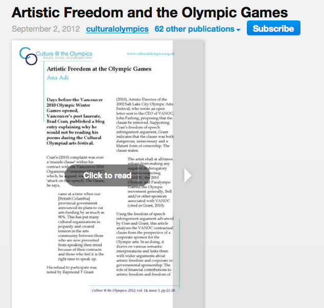 The new edition of Culture @ the Olympics hosts an article I wrote about the contractual limitations for artists working around the Vancouver 2010 Olympic Winter Games, treat from the perspective of a corporate sponsor for the Olympic arts. The entire article is below: